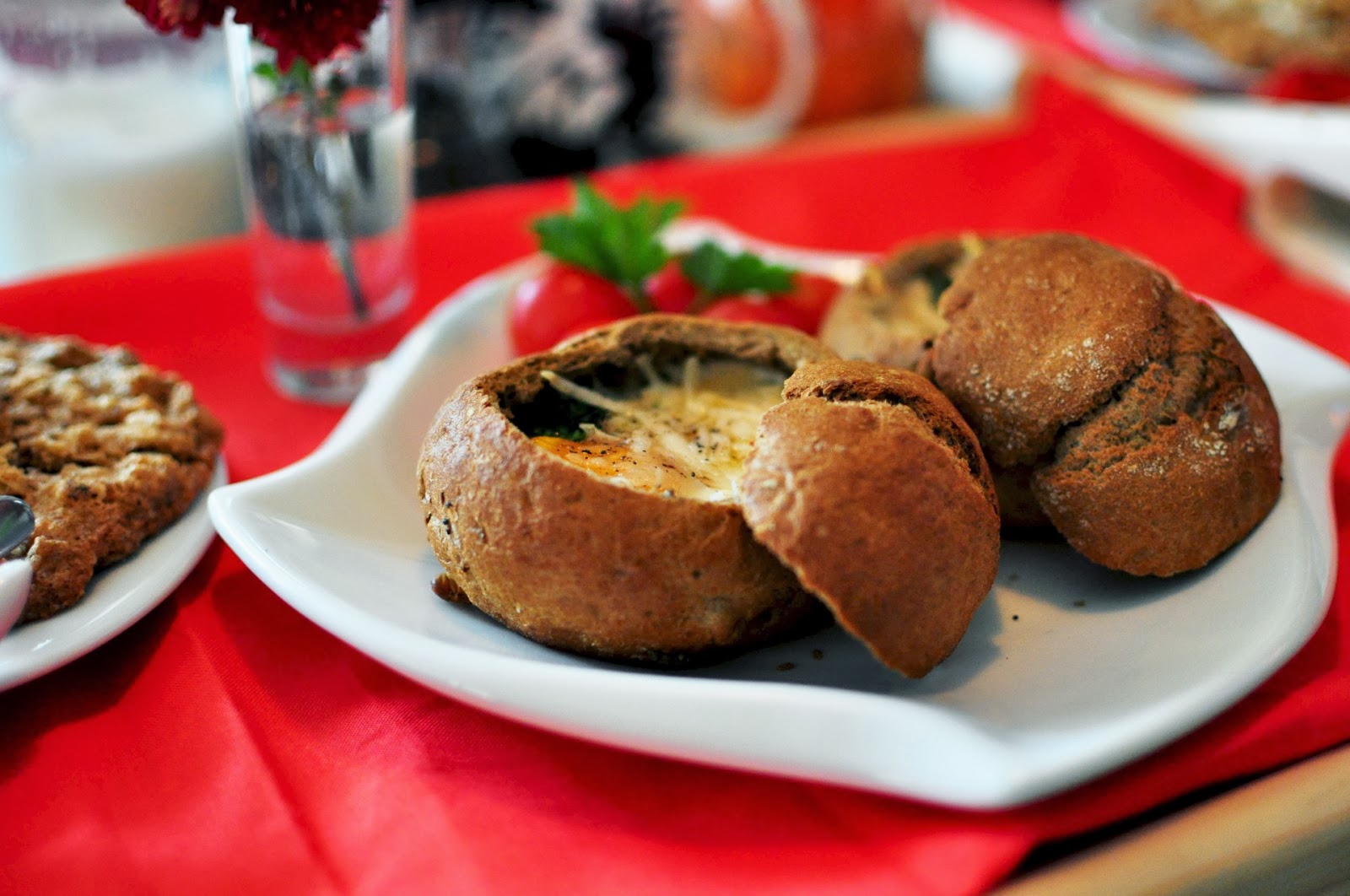 De micul dejun ce să vă spun, de vis. Și sunt pretențios rău cu micul dejun. Sau nu. Pe mine mă cucerești cu lăpticul din prima. Dar pe lângă asta mi-a și oferit niște idei foarte bune. Chifle umplute cu ou, brânză, diferite ierburi, cred că am prins și niște ceapă verde pe-acolo, băgate probabil la cuptor, ce să mai, Dumnezeu pe pământ. Capacul chiflei se sparge în gălbenușul oului și se înmoaie pentru a nu ronțăi pâinea tare din cuptor și pe lângă asta se adaugă roșiile cherry.